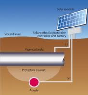 Se ha desarrollado un sistema que utiliza un generador eléctrico solar donde la corriente continua se inyecta a la tubería conectando el polo negativo del generador a la tuberia y el polo positivo a la cama anodica. Este sistema es una excelente alternativa de protección, ya que se puede instalar en sitios remotos donde no hay suministro de energía |